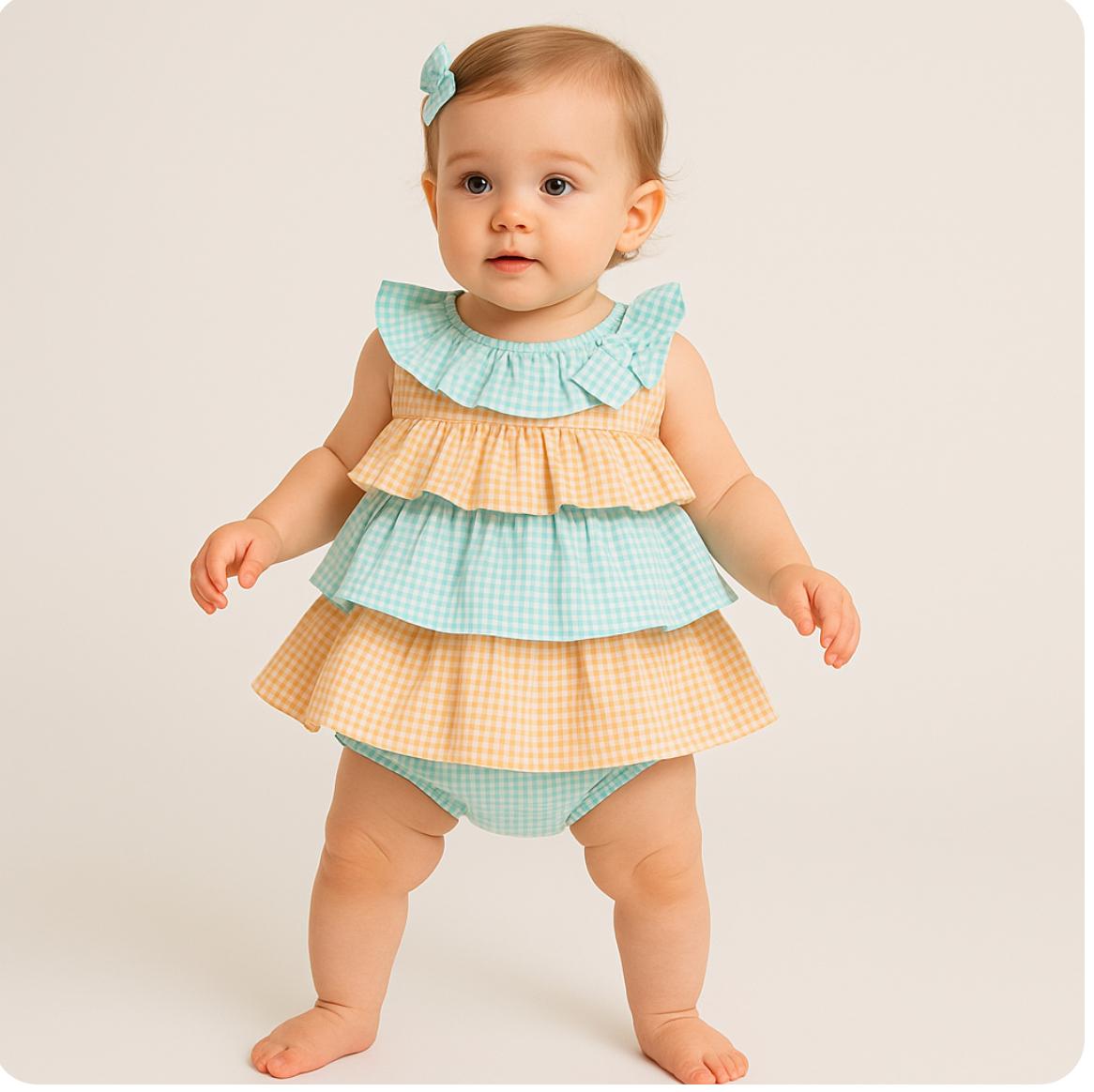 طقم مواليد بنات مكوّن من قطعتين مع كولت من ماركة Tutto Piccolo، تصميم أنيق بنقشة مربعات صغيرة باللون