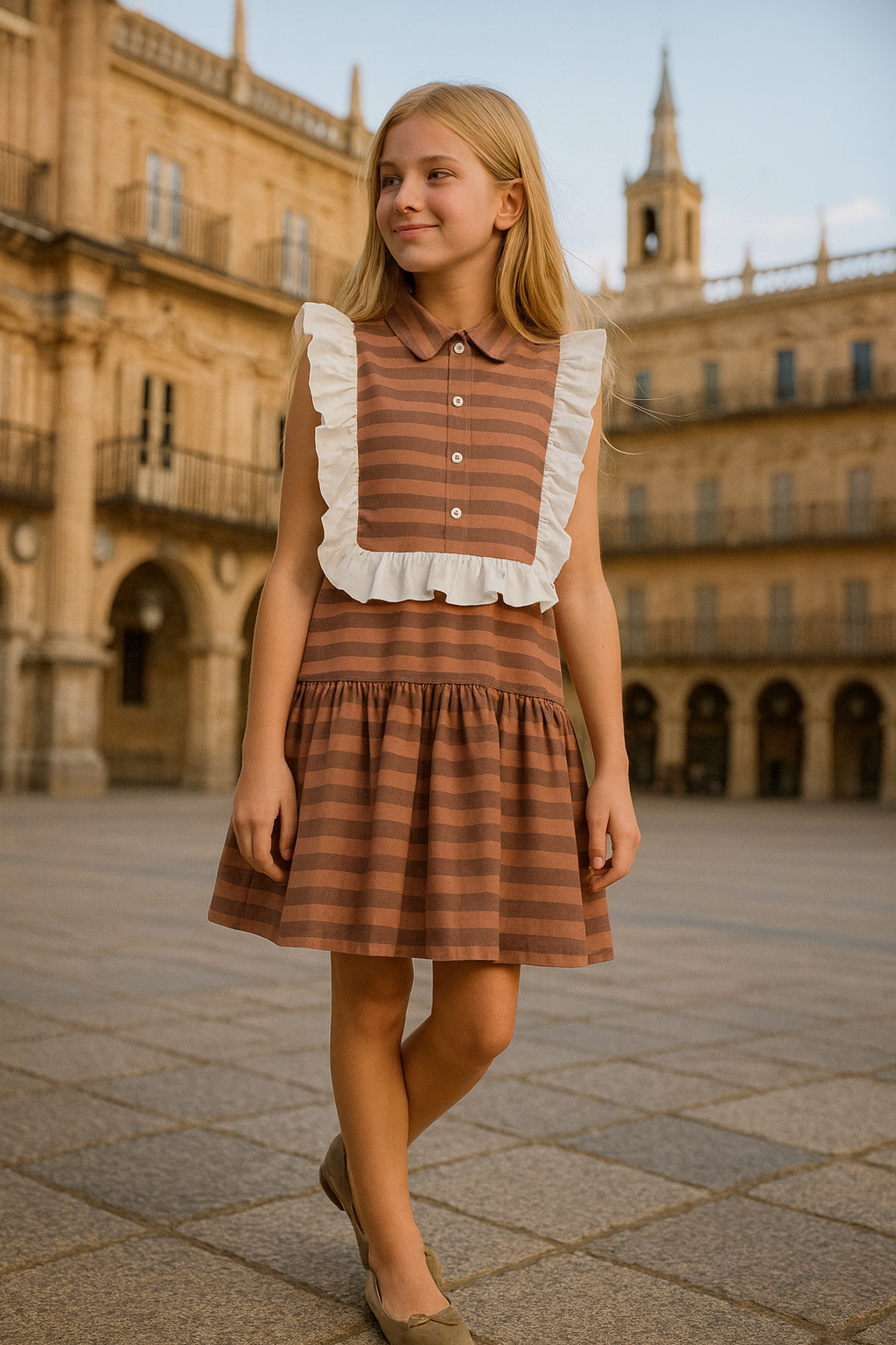 اللون والنقشة: الفستان مخطط باللونين البني والبيج الفاتح بطريقة أفقية تضفي لمسة كلاسيكية ناعمة.
